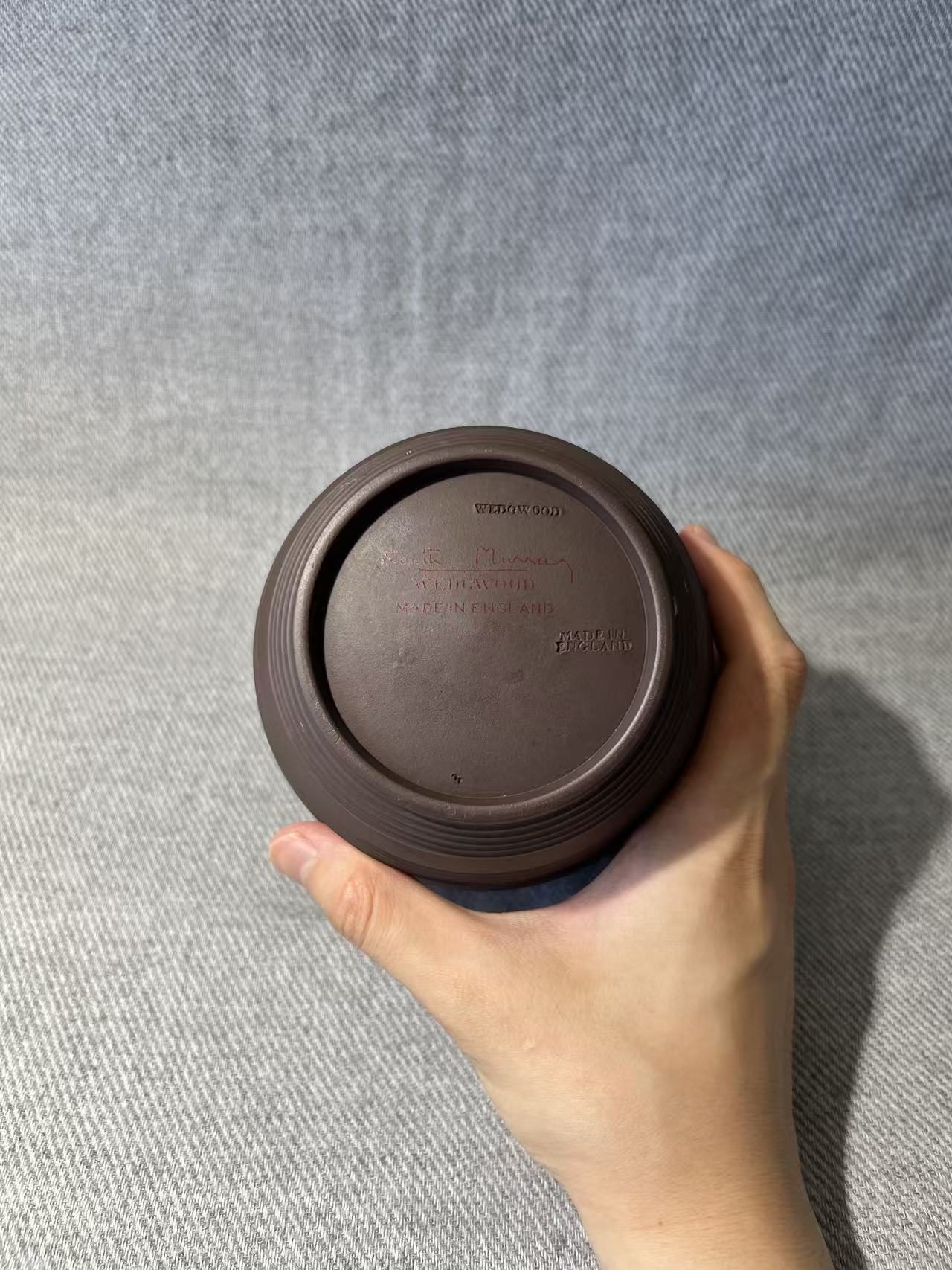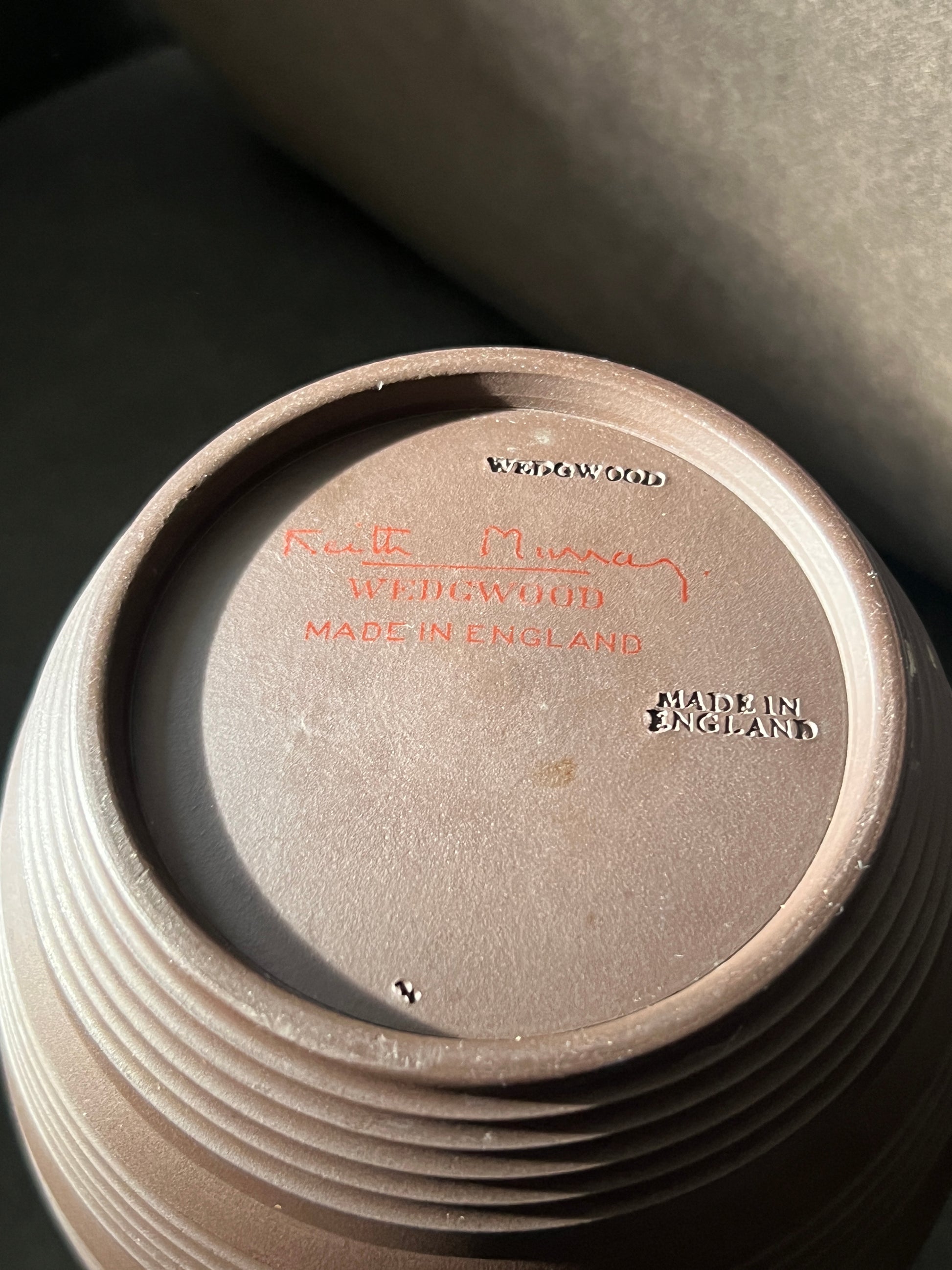 The Wedgwood Keith Murray model 3868, dating from around 1935, features earthenware crafted with a distinctive bronze basalt glaze. Standing 16.5 cm tall, it bears printed and impressed factory marks alongside Keith Murray’s facsimile signatures.