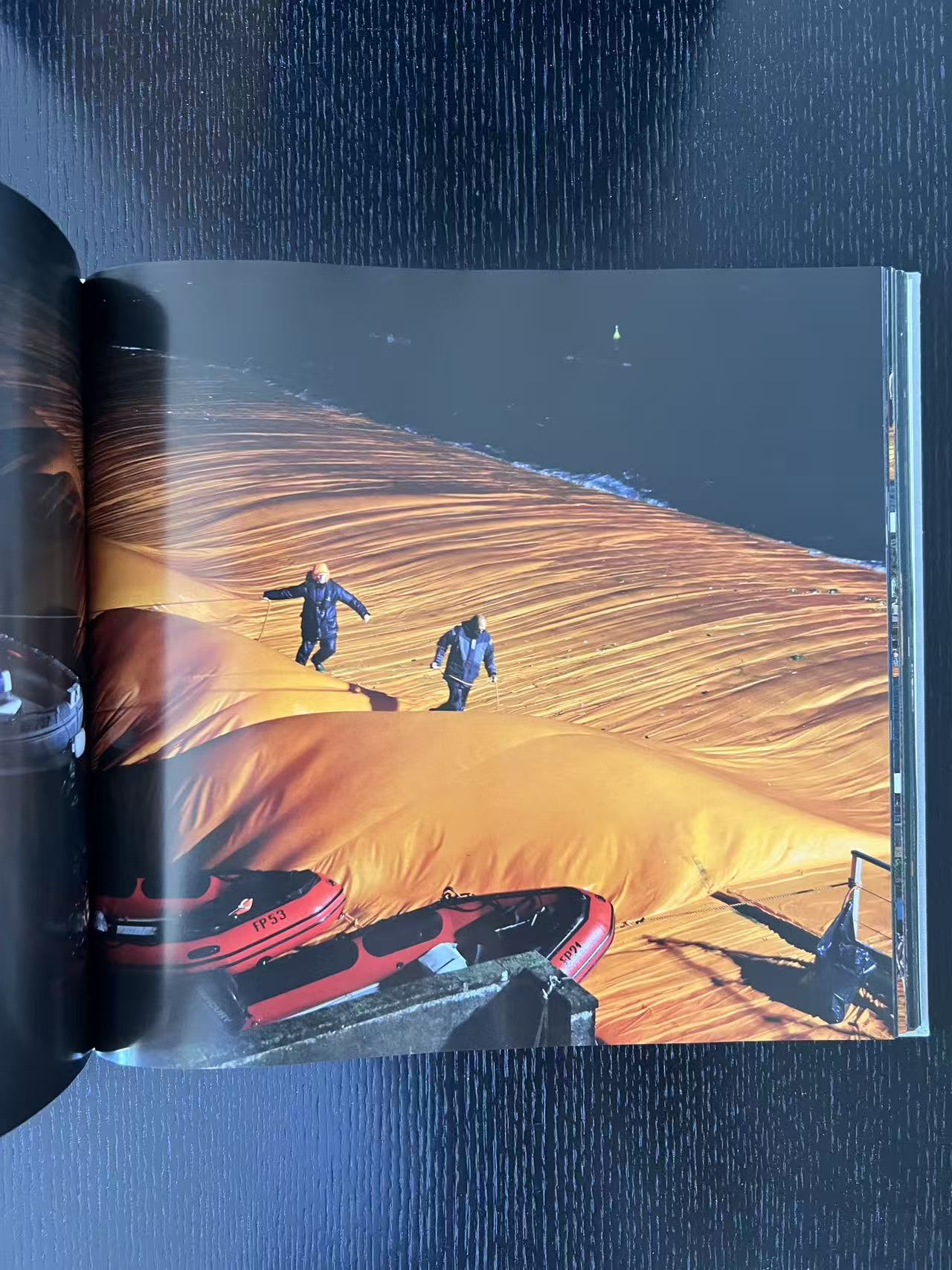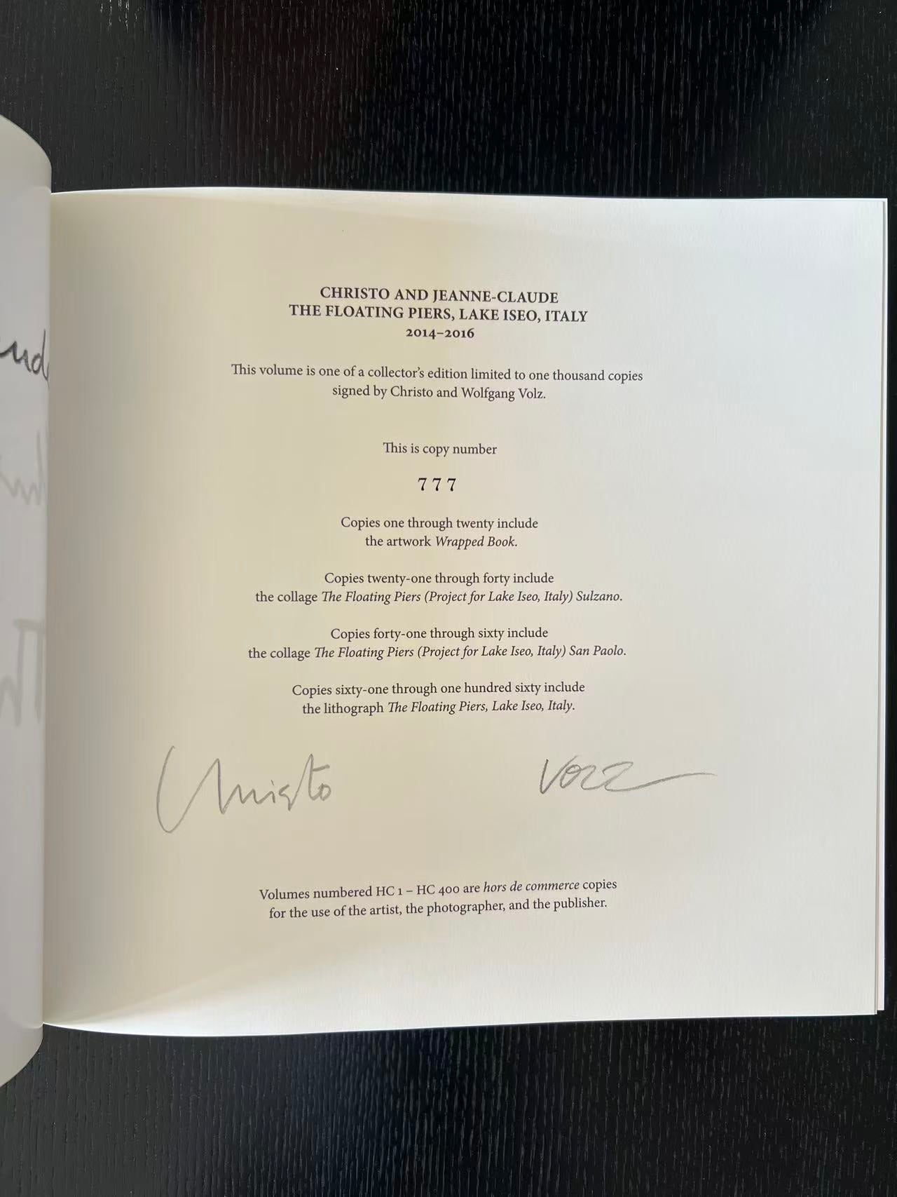 The Floating Piers, Lake Iseo, Italy (2014) is a rare collector’s edition celebrating Christo & Jeanne-Claude’s monumental installation that transformed Italy’s Lake Iseo in June 2016. This limited edition of 1,000 copies includes a color offset lithograph, hand-signed by the artist, and an authentic piece of the original saffron fabric used in the installation. The present example, numbered H.C, was reserved for the artist, photographer, and printer. Presented framed in a custom box, this edition captures the spirit of Christo & Jeanne-Claude’s ephemeral yet deeply poetic environmental art.